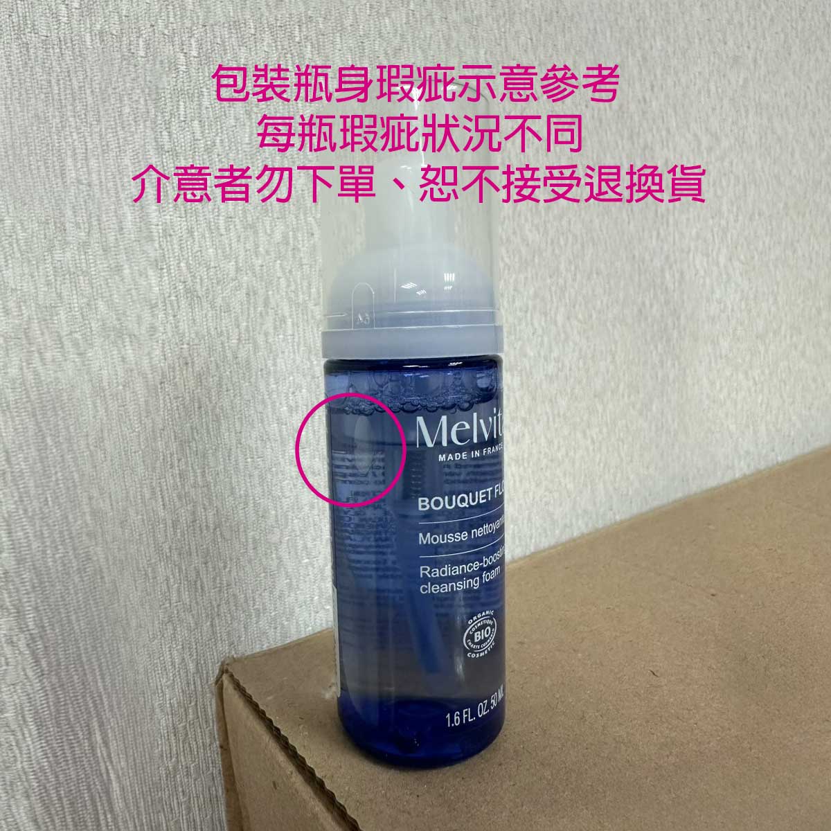 包裝瓶身瑕疵為氣泡或黑點髒污,每瓶瑕疵狀況不同,介意者勿下單、恕不接受退換貨。