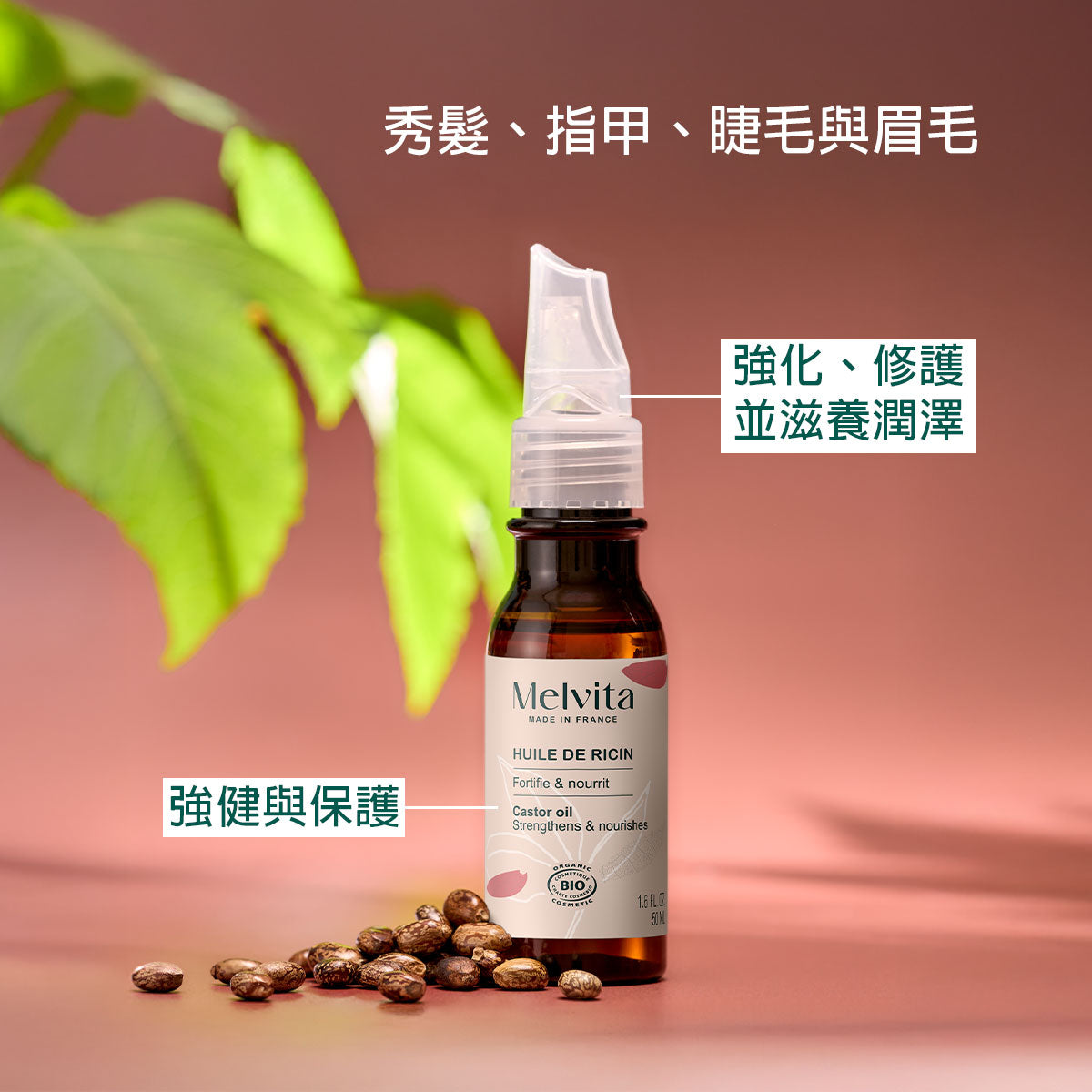 Melvita 蓖麻油以其保護、滋養和強韌功效而聞名。能有效強韌秀髮,強化指甲、指緣,讓睫毛和眉毛看起來更加豐盈亮澤。