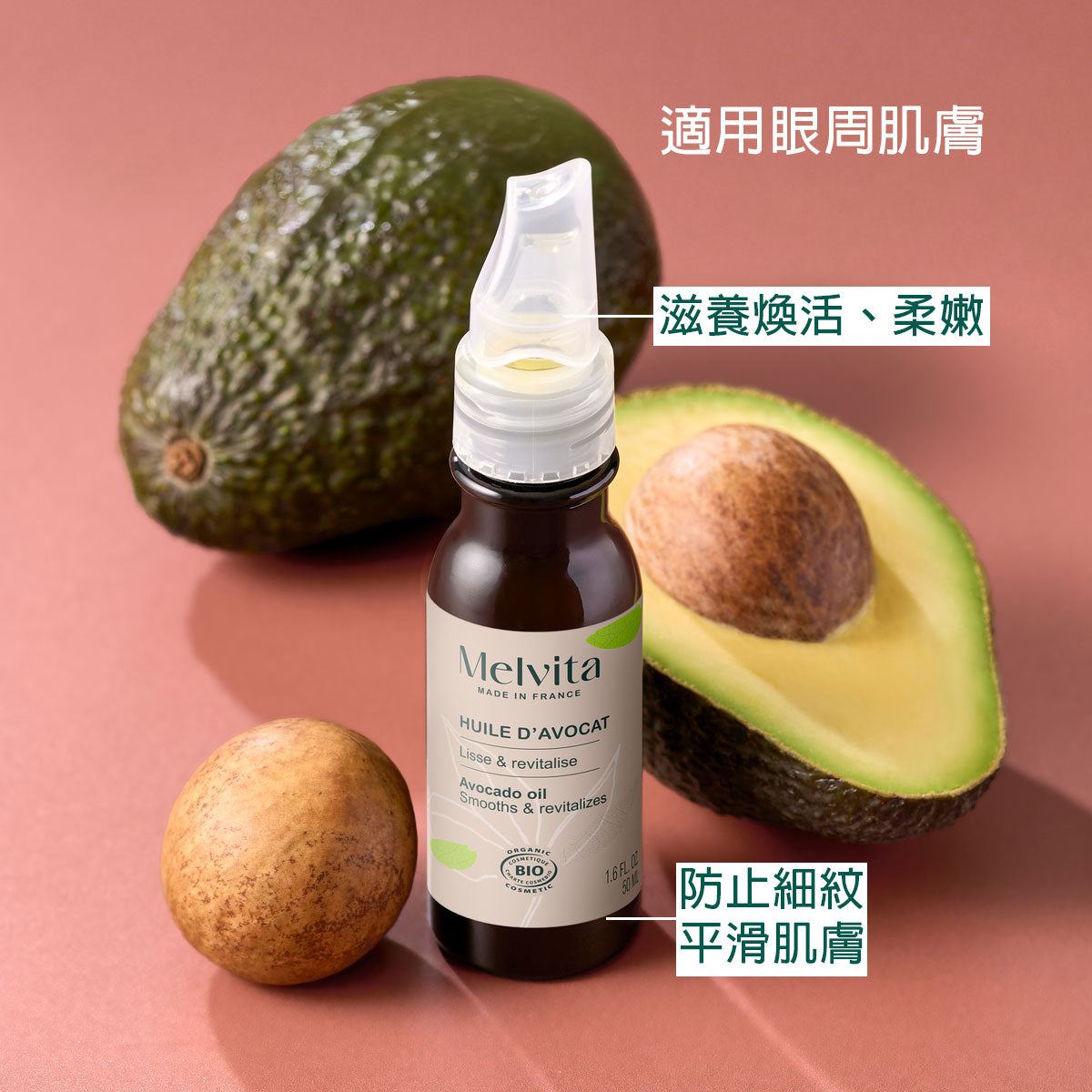 Melvita 酪梨油是眼周肌膚的理想保養品。富含必需脂肪酸和維他命A、D、E,能夠滋養、撫平並煥活臉部最嬌嫩細緻的部位。